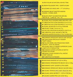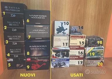 Vendo attrezzatura da pesca mare e acque interne per spinning, surfcasting, bolognese, inglese, feeder, beach legering, legering, match nuova e usata proveniente dalla mia collezione privata, quindi gli articoli sono senza scontrino o garanzia. Disponibili canne, mulinelli, artificiali, borse, gilet, accessori delle migliori marche. 🎯 Alcuni oggetti potrebbero essere già venduti (lotti pubblicati anche su altre piattaforme): contattami per disponibilità aggiornata, elenco e prezzi. 🎣 Canne top di gamma: Zenaq, Shimano, Molix, Daiwa, Graphiteleader, Seaspin, G. Loomis, Rais, Megabass, Majorcraft, Apia, Colmic, Falcon, Tubertini, Trabucco, 🎣 Mulinelli premium: Daiwa PX 1350 , Daiwa PM 1350 HM – Shimano Stradic - Shimano Sedona - Shimano Symetre - Shimano Club Demi 10RL - Shimano SARAGOSA SW-A 5000 - Abu Garcia Superior 3000 - Penn Conflict 5000 - Daiwa Ballistic 3000 - Daiwa Tatula 3000 - Shimano Vanford 4000 - Shimano Aero 4000 🎒 Accessori e artificiali: Gilet: Mazume Scatole porta artificiali: Plano, Mehio Artificiali: Daiwa, Shimano, Megabass, IMA, Seaspin, Apia, Angler Utopia, Lurenzo, Jackfin, DUO, Rapala, Little Jack Porta EGI: Daiwa EGI: Yamashita 📷 Foto e video disponibili su richiesta per ogni articolo. ✅ Se interessati a uno o più articoli, posso aprire inserzione dedicata su Subito dopo accordi su spedizione e pagamento. Attenzione! Alcuni prodotti nell'elenco sono USATI chiedete quali prima di acquistare grazie Il venditore dichiara che il bene oggetto del presente annuncio è originale