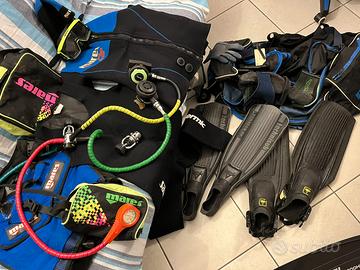 vendo in blocco per cessata attivita' marca Mares : 2 erogatori primi stadi con manometro, muta 5 mm completa , borsone guanti calzari maschera , pinne L calzata posteriore e a scarpetta 42/ 43 , eventuale Gav, consegna a mano in Milano e Monza , serieta' visto e piaciuto contanti Prezzo trattabile