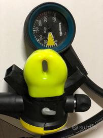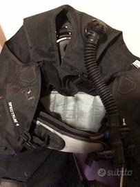 jacket tg. small, pinne tg. 36, borsone specifico. Cintura con pesi (sei), muta Cressi sub da donna tg. III pant e tg. II giacca, un erogatore.