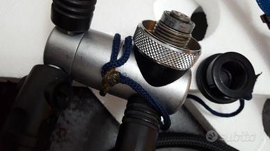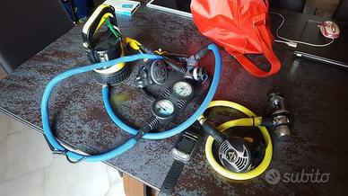 Muta stagna Mobbys bilaminato completa di orsetto con cintura portapesi e cappuccio-lampada Vega senza batterie-gruppo erogatore Scubapro con manometro e profondimetro-erogatore di riserva Cressi-computer Mares Tutor. Borsone sub Mares. Vendo anche separatamente muta .
