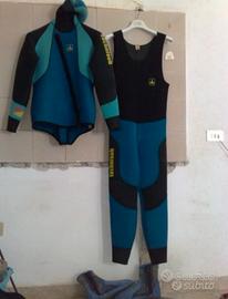 - Muta bifoderata da 5 mm con incorporata sul polso destro la "tabella della curva di sicurezza", con pantaloni a salopette e giacca con cappuccio incorporato. La muta ha una taglia ideale per persone alte fino a 1,75/1,80 m di altezza e un peso fino a 75 kg