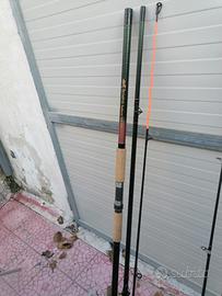 Vendo 2 italcanna cougaro 170gr. Mt 4.30 6 sezioni 2 mulinelli Daiwa Emblem 5000 X e Z doppia bobina 1 ripartita 3 pezzi 100/250gr. Mt4. 20 Freelander bx 1 ripartita 3pezzi 150/250 gr. Mt 4.20 Typhoon 2 picchetti da Mt 1.30 1 treppiedi 1 carrello 1 cassetta così come da foto non vendo separati, no perditempo