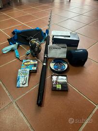 Cedo in blocco attrezzatura composta da mulinello Tyrnos 20 libbre completo di scatola ed accessori con canna Shimano 20/30 libbre,confezione nylon Asso tripla forza 0,62, confezione fluorocarbon Seguar 0,62,confezione trecciato Stren superbraid 0,30,confezione ami Gamakatsu, cintura combattimento Sardamatic con agganci Harness, pronta all’uso.