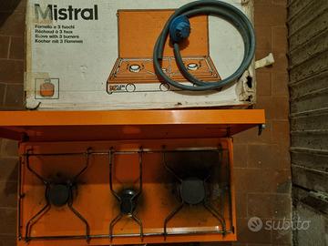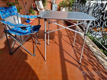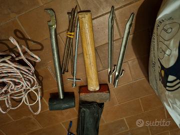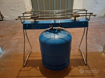 lettino, due sedie pieghevoli con tavolino smontabile 70 x 70, picchetti tiranti e martelli, cavo elettrico con prese da campeggio, fornelli a gas