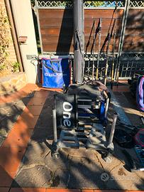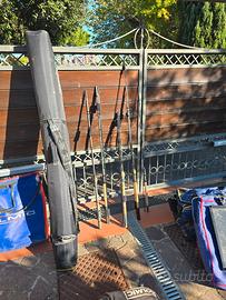 Canna colmic, canna drenan, 2 canne italica, canna krion, canna daiwa proteus, sacca matrix con picchetti mt 1,95, borsone colmic, vassoio colmic 65×50 con sacca, nassa con sacca, paniere colmic one con vari accessori, ombrellone matrix.