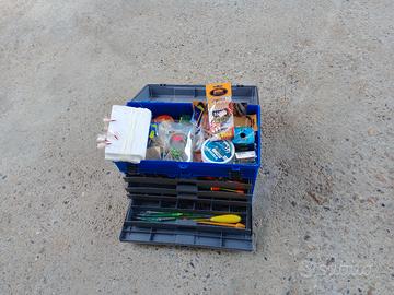Vendo attrezzatura per pesca in mare,canna per traina da 30 libre,rotella per bolentino in acciaio inox,800 mt di filo professionale diametro 1,40(per bolentino o madre per palamito). cassetta piena di montature,ami, artificiali,girelle,ecc.ecc.(materiale nuovo). Attrezzatura per pesca da gommone o barca.