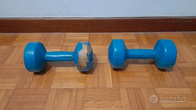2 manubri (o pesi liberi) da 5kg: sono uno degli attrezzi più versatili per l'allenamento della parte superiore del corpo, con essi si può lavorare su bicipiti, tricipiti, spalle, pettorali, schiena. Con un carico moderato e alte ripetizioni, i manubri aiutano ad aumentare la resistenza dei muscoli. Uno dei due è un po' rovinato, se interessati chiedete pure e vi mostro in che punto.