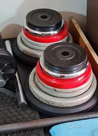 Attrezzi per allenamento n. 1 Panca multiuso, n.3 Bilancieri di cui uno Angolare di diverso peso e misure, n. 8 Manubri, 170kg di Dischi di diverso peso, n. 1 Panca per Addominali e per qualsiasi altro esercizio, inoltre non visibili in foto mollette ferma dischi ed altri accessori compresi. Vero Affare solo ritiro non si effettua spedizione astenersi perditempo.