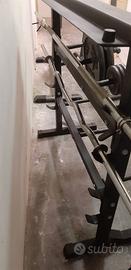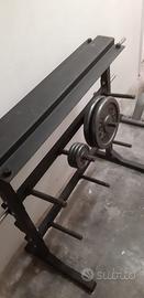 Rack porta-pesi con bilancieri (dritto + EZ bar) e dischi vari 2 x 10kg, 4 x 1.25kg.