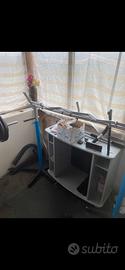 attrezzi per palestra da casa perfetti per allenare l’essenziale ,è presente una panca beige multifunzione con spot in ferro e degli attrezzi per fare le gambe,una panca nera reclinabile in diverse inclinazioni con cuscino smontabile per fare i curl per i bicipiti, porta dischi e dischi in ferro da pesi a partire da 1 a 10 kg(totale 211 chili)