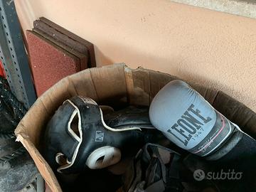 Panca Tappetini neri e rossi 2 bilanceri e vari pesi Sacco box con staffe Caschetti guantoni corda Foto reali