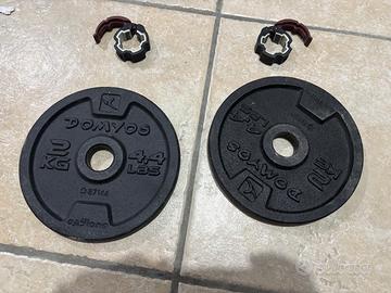 Vendo bilanciere non olimpionico di corca 8 kg e set di pesi formato da 2 dischi da 10kg e 2 da 2 kg, con due fermopesi. In buono stato sono solo stati usati per 1 anno. Consegna a mano. Prezzo trattabile.