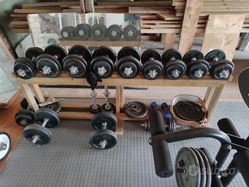 Vendo tutti gli attrezzi per palestra che vedete in foto a 1200€. Ci sono circa 470kg di pesi e solo quelli costano piu di quello che chiedo per cui NON tratto il prezzo e NON vendo pezzi singoli