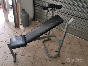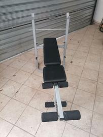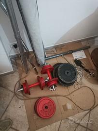 Attrezzatura per palestra,usata poche volte,comprende 4 dischi in ghisa da 10kg,4 dischi da 5kg,due bilancieri da 15kg , una panca reclinabile 2 manubri.