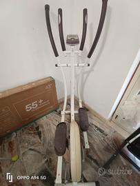 Vendo Tapis roulant motorizzato per uso domestico, marchio BSQ. Tipo: Tapis roulant elettrico pieghevole. Funzioni: Consente di monitorare tempo, velocità, distanza, calorie e frequenza cardiaca tramite la console. Struttura: Dotato di nastro su cui camminare o correre e supporti per le mani. Uso: Ideale per allenamento cardiovascolare e potenziamento degli arti inferiori in casa. Bici ellittica L'oggetto nell'immagine è una bicicletta ellittica Domyos VE 420. Tipo: Bicicletta ellittica da casa. Funzionalità: Sistema di resistenza magnetica per una pedalata fluida e silenziosa. Console: Display LCD che mostra tempo, distanza, velocità e calorie bruciate. Accessori: Include un supporto per tablet o smartphone.