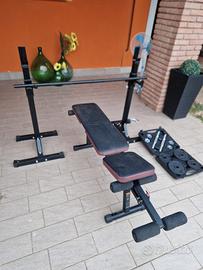 Vendo set pesi da 25kg, asta per panca, supporti per bilancere, Panca richiudubile ed inclnabile a 30° 45° e 80° vendo per inutilizzo