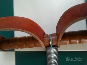 Vendo attrezzo ginnico / estensore con molla vintage, probabilmente degli anni '70, realizzato con impugnature in legno, molla in metallo e spesse strisce di cuoio , in buone condizioni estetiche e di funzionamento , in quanto solido e perfettamente estensibile,