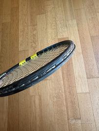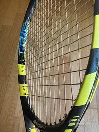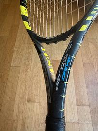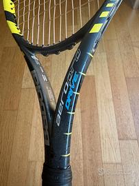 Babolat Aero Pro Drive (versione test: vedi foto) Piatto 100, 16x19 Peso 300 g, bilanciamento 32 cm Grip L3 Usata, da collezione per gli amanti del genere, ma ancora integra e pienamente utilizzabile. La superficie del telaio ha alcune macchie e mostra i segni del tempo (un po' sticky nella parte centrale: v. foto), ma nessuna crepa o scheggiatura rilevante. Passacorde integri. Grip sostituito nuovo e sempre usata con overgrip.
