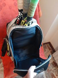 Zaino 🎒 da tennis 🎾 Babolat con tecnologia Aero. Zaino molto bello,usato due volte,la parte davanti è rigida. Ci stanno comode 3 racchette nella tasca dietro,nel tascone davanti si può mettere abbigliamento e accessori. Spallacci e schienale sono imbottiti,molto comodo da portare. N.B. LE RACCHETTE NON SONO IN VENDITA CON LO ZAINO.