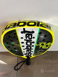 racchetta unisex da padel modello Babolat Counter Veron, forma ibrida , progettata per giocatori di livello intermedio che cercano un equilibrio tra controllo e potenza. Ottimo stato Struttura interna integra Sbeccature e graffi sul telaio visibili da foto, copribili con nastro protettivo nero ( che ho tolto x far vedere effettivo stato della pala)