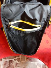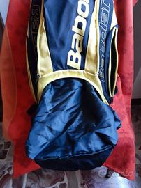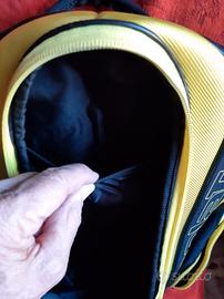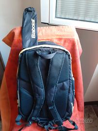 Zaino Babolat Pure 🎾 in tessuto nero e giallo, ideale per lo sport o il tempo libero. Ci sono diverse tasche,anche tasca con fodera per le scarpe. Zaino 🎒 NUOVO senza cartellino usato come campione da esposizione in fiera. - Logo Babolat stampato. - Tasche laterali. - Chiusura con zip.