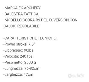 Come da titolo vendo la balestra indicata. il prodotto Γ¨ praticamente nuovo, usato solo 2 volte ( troppo lontano da me il campo di tiro) Viene venduta, completa del suo imballo originale, libretto istruzioni, mirino Red Rot, 4 frecce in carbonio originali. In regalo luce laterale giΓ montata. Pagata 230 euro, vendo a sole 120 euro. ( Non chiedetemi sconti) π¨π¨π¨π¨π¨π¨π¨π¨π¨π¨π¨π¨π¨π¨π¨π¨ Preferisco ritiro a mano, ma posso spedire con spese a carico destinatario. Pagamento accettati : Contanti o PayPal. π¨π¨π¨π¨π¨π¨π¨π¨π¨π¨π¨π¨π¨π¨π¨π¨ FinchΓ© vedete l'annuncio il prodotto Γ¨ disponibile. Grazie.