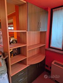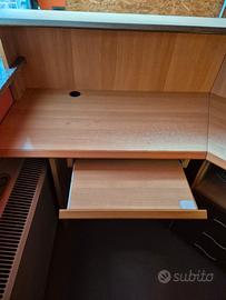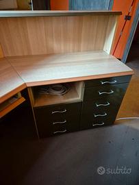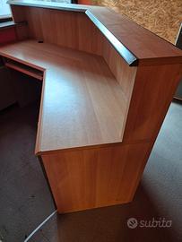 bancone reception con cassetti e mobile di fondo con cassetti, ante e spazi a giorno