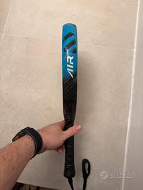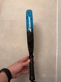Racchetta usata poco perché non gradita, perfetta, solo una scheggiatura della vernice sulla punta che non compromette integrita della racchetta in nessun modo, no crepe no tagli.