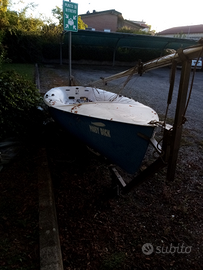 Barca a vela lunghezza 4,20, da ristrutturare manca il tuca poggiata su un carrello in acciaio da traino ruote da sostituire vendo in blocco non spedisco la barca si trova a Correggio re x visione, trasporto a carico dell'acquirente prezzo trattabile.