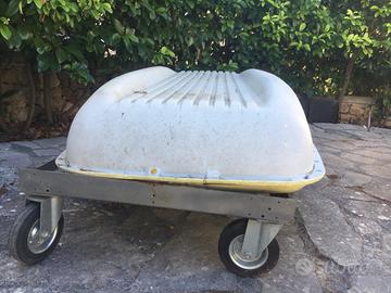 1 Barchetta in plastica come da immagini con dotazione 1 carrello a spinta manuale con 4 ruote, 2 scalmi, due remi, 1 ciambella salvagente.