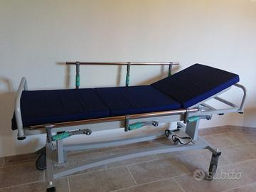 Vendo la barella medica professionale con intelaiatura radiotrasparente, poggiatesta regolabile, sponde laterali e supporto per bombola di ossigeno.