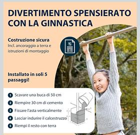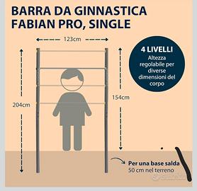 Scopri la sbarra ginnica HUDORA Fabian: il tuo dispositivo di allenamento definitivo per fitness, ginnastica ed esercizi alla sbarra! Con la sbarra ginnica HUDORA Fabian, porti una sbarra in acciaio multifunzionale di alta qualità nel tuo giardino. Questo versatile dispositivo di allenamento è perfetto sia per bambini che per adulti ed offre un efficace allenamento alla sbarra. Le attrezzature per la ginnastica sono disponibili in due modelli, Standard e Pro, ed entrambi sono disponibili come sbarre singole e doppie. Le attrezzature Pro presentano una massima stabilità con una struttura a sbarra rinforzata trasversalmente. La sbarra ginnica HUDORA Fabian ti conquisterà non solo per la sua funzionalità, ma anche per il suo design accattivante. Sia che tu scelga la versione Standard o Pro, queste attrezzature per la ginnastica si abbinano perfettamente ad altri dispositivi, come preferisci. Il montaggio nel giardino è un gioco da ragazzi, in quanto la sbarra ginnica viene fornita con il materiale di fissaggio incluso. Per garantire una base solida, la sbarra ginnica viene cementata nel terreno fino a 50 cm di altezza. Con quattro fori preforati, la sbarra è regolabile in altezza in quattro posizioni, da 71,5 cm a 150 cm, per consentire un allenamento ottimale sia per bambini che per adulti. La nostra sbarra ginnica in acciaio inossidabile è resistente alla corrosione e ha un diametro di 25 mm, il che la rende particolarmente robusta. Può sopportare un peso fino a 100 kg ed è quindi adatta a tutta la famiglia. La sbarra ginnica HUDORA Fabian non è solo un dispositivo sportivo, ma fa parte del tuo stile di vita. HUDORA, un'azienda familiare di quarta generazione, è sinonimo di qualità, sostenibilità e responsabilità sociale. Siamo orgogliosi di entusiasmare i nostri fan in tutta Europa e offrire prezzi equi per la massima qualità. Scopri la versatilità della sbarra ginnica HUDORA Fabian e vivi il divertimento del movimento condiviso! Porta a casa tua un pez