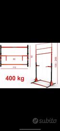 ZIDER SPORT Barra per pull up o guida dip pieghevole per allenamento della forza, libera, regolabile, struttura rinforzata. SUPPORTO PER ESERCIZI: rastrelliera fissa per esercizi. La struttura in acciaio verniciato a polvere, resistente e stabile, garantisce stabilità. Costruzione saldata, con due fissaggi in acciaio. Adatta per l'uso professionale in palestra o a casa, per principianti e professionisti. Contenuto: 2 x dip, 2 x tricipiti. • APPLICAZIONE: Adatta per esercizi, compreso il crosstit e l'allenamento calistenico. Barra per trazioni, stazione dip e maniglie per flessioni in un unico dispositivo. Ti consente di risparmiare spazio e condurre un allenamento efficace. Dispone di ben 8 regolazioni di altezza orizzontali - da 135 a 245 cm. • SICUREZZA: Tubo aggiuntivo all'interno del corrimano. La tecnologia Double Pipe aumenta la durata fino a 400 kg. Fornisce inoltre una posizione stabile per gli esercizi di oscillazione, ha piedini antiscivolo e antigraffio. • COSTRUZIONE: I massicci profili del telaio e il doppio tubo rendono la struttura indistruttibile. È una scelta eccellente per le persone che cercano la massima qualità e vogliono godersi i propri esercizi senza interruzioni!