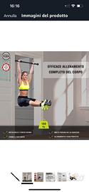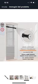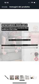 Barra trazioni per porta. Regolabile da 66,5 cm a 93 cm. Utilizzabile con o senza viti. Antiscivolo. Presa sicura. Maniglie in schiuma. Per una mia svista ne ho acquistate 10 (dieci!) invece che una (che era quella che mi serviva). Quindi ne ho 9 (nove) da vendere perché sono fuori tempo per il reso. Nuove di pacca, mai aperte, sono ancora nella loro confezione originale sigillata