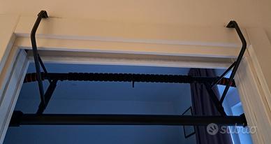 Barra per trazioni a pressione per porta nuovo con protezioni di gomma per non rovinare la cornice della porta. Lunghezza di 1 metro e distanza tra i 2 ganci 65 cm e altezza tra la parte alta e bassa della barra è 27 cm circa. Con anello già incluso per poter inserire un elastico per un potenziamento completo e dotata di una comoda impugnatura imbottita.