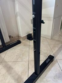 Barre Parallele Dips Corength Regolabili e compatte Utilizzate pochissimo per allenamenti a corpo libero, calisthenics. Queste barre parallele sono compatte e facili da riporre grazie ai piedi pieghevoli. Lavora tutti i muscoli con il peso del corpo, con esercizi statici o dinamici. Dimensioni e peso delle barre per dip e dell'imballo Dimensioni in posizione "piatta": - Lunghezza: 110 cm. - Larghezza: 11,2cm. - Altezza: 70 cm. Dimensioni in posizione "standard", la più alta: - Lunghezza: 67 cm. - Larghezza: 102cm. - Altezza: 93 cm. Le 2 barre pesano 12,4 Kg. Dimensioni del cartone: - Lunghezza: 77 cm. - Larghezza: 60cm. - Altezza: 12 cm. Le 2 barre nel cartone pesano 14,3 Kg. Installare bene le barre per dip, per una stabilità a prova di tutto Per permetterti di dedicarti esclusivamente all'allenamento, scegli bene il tipo di rivestimento su cui appoggi le barre. Infatti, se fossero presenti delle irregolarità, le barre rischierebbero di muoversi. Puoi anche bloccare le barre con dei pesi o con dei sacchi zavorra. Fai una prova, se non si muovono sono pronte! Stringi bene anche le viti a farfalla, in modo da elimitare eventuali giochi. I pattini delle barre sono antiscivolo.