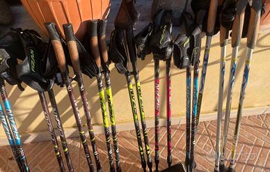 N. 9 coppie di bastoncini marca Fizan Speed con impugnatura in sughero e lacciolo sganciabile con sistema veloce tramite pulsante + n. 2 coppie di bastoncini marca Df-Sport Specialist con impugnatura in sughero e lacciolo sganciabile con sistema veloce tramite pulsante. Tutte e undici le coppie di bastoncini sono regolabili in altezza perché hanno due sezioni e sono completi di gommini per vibrazioni + Sacca Fizan nera con logo . Si vende solo in blocco