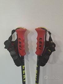 Bastoncini da sci Leki, 135 cm, curvi (adatti a GS e SG ma vanno benissimo anche per non agonisti) con laccetto "a guantino" con sgancio rapido, come da foto.