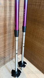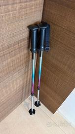 Vendo coppia di bastoncini da sci Wed'ze telescopici, regolabili da 70 a 105 cm. Colore degradé viola/azzurro. Impugnatura in gomma con laccio regolabile, ghiera a rotella con blocco di sicurezza, puntale e rondelle in dotazione. Condizioni ottime, usati pochissimo. Ideali per sci su pista, adatti a bambini grandi e adulti di statura media.