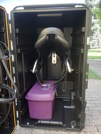 Baule da scuderia con poggiasella richiudibile, 2 portabriglie, rete elastica e piedini in gomma (mai usato). Dotato di ruote e manico estraibile, si trasforma in trolley.