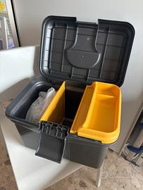 Bauletto / baule per equitazione per contenere tutti gli accessori necessari alla toelettatura del cavallo. Color grigio scuro con divisori (removibili) gialli.