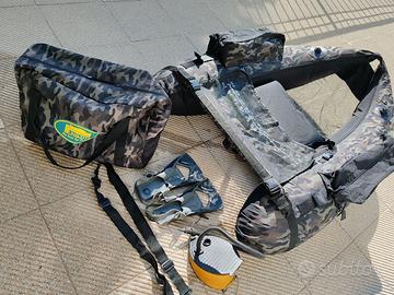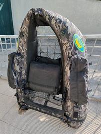 Vendo Belly Boat ottimo per la pesca del luccio e del boccalone. equipaggiato con valvole di sicurezza BS "Boston Style" rivestito con tessuto Oxford e rinforzi Oxford per garantire la massima sicurezza, il belly boat è fornito di sgancio rapido di sicurezza. Camere d'aria in PVC da 0,48mm in elementi separati per garantire la massima sicurezza. La speciale forma a "V" idrodinamica è il massimo per la stabilità, mobilità e velocità. Frontale aperto per facilitare l'alaggio ed il varo, per entrare ed uscire dall'acqua ancora più facilmente. Portacanne frontale e laterale con pratico velcro. Schienale ultra comodo in schiuma di poliuretano. Tasche laterali impermeabili. Misure (Gonfiato) Cm 150x112x34 Peso: 3,6 Kg Inclusa Borsa per il trasporto e pompa per il gonfiaggio. Portata 140Kg