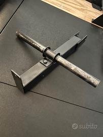 L’attrezzatura è realizzata in parte in modo artigianale, con specifico riferimento alla componente destinata al carico dei dischi. È predisposta per l’utilizzo di dischi con foro da 50 mm e consente un carico massimo stimato di circa 200 kg.