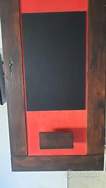 Bellissimo mobiletto,tutto fatto artigianalmente, con porta freccette,lavagnetta segna punti con porta gessi e Bersaglio professionale. L 60xH 77x P 14 cm