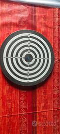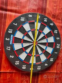 Bersaglio per freccette in legno spessore 2,5 cm, diametro 45 cm, comprese 6 freccette semiprofessionali di cui 3 con custodia. Venduto nelle condizioni di visto e piaciuto non si accettano restituzioni.