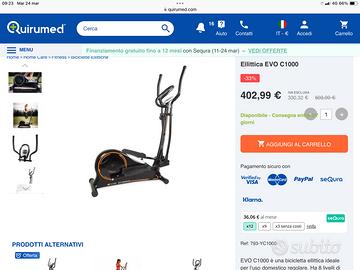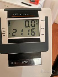 Vendo ellittica EVO C1000 in ottimo stato, con sistema di freno magnetico e 8 livelli di intensità. Dotata di pedali regolabili e monitor con schermo LCD dove sono indicati tutti i dati di allenamento: tempo, velocità / RPM, distanza, calorie e pulsazioni. DATI TECNICI: Sistema inerziale: 12 Kg - Lunghezza del passo: 33 cm - Peso dell’ellittica 44 Kg - Dimensioni: 150 x 61 x 167 cm - Peso massimo dell’utente: 110 Kg. L’ellittica é robusta e ben fatta ed é progettata per un uso domestico quotidiano. Attualmente in vendita a 599 euro sul sito del produttore, si trova in offerta on-line a non meno di 400 euro. Vendo per passaggio ad ellittica Tecnogym.