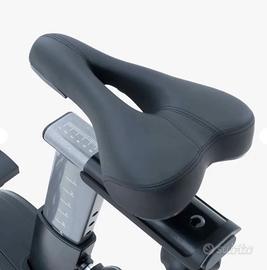 Sport bike magnetica a volano bilanciato posteriore (massa volanica 22 kg) con scatto fisso e trasmissione a cinghia silenziata di fascia alta nel mondo vertical fitness equipaggiata con un freno magnetico (potenza 305 W a 60 RPM) con regolazione elettronica e gestito da un servo motore comandato dalla console; pedivella da 17 cm. La pedalata è fluida e costante anche alle alte resistenze. Per un ottimo comfort ha la regolazione in altezza della sella su 8 posizioni (misura della gamba da 69 cm a 91 cm) e in profondità 6 cm, il manubrio multi-presa rivestito in dipping professionale con prese basse, si regola in altezza su 8 posizioni e in profondità 6,5 cm; queste ampie regolazioni permettono di trovare sempre la migliore posizione in sella ad ogni utilizzatore. La sella racing design, anatomica, con foro centrale ed imbottitura pro, aiuta e migliora la sensazione a bordo garantendo confortevoli e lunghe pedalate senza particolari fastidi. Il pedale racing antiscivolo in alluminio big size con attacco rapido SPD e cinghietto ferma piede, aiuta a mantenere il corretto appoggio della scarpa. Il particolare computer a “disco” con due LED bianchi multi-informazione e la funzione integrata start/stop e incremento/decremento resistenza, permette di visualizzare nella modalità scan tutti i parametri dell’allenamento cardio, quali: tempo, distanza, velocità, RPM, calorie, Watt, frequenza cardiaca, n° livello resistenza. É dotata di un sensore nella console per rilevare la frequenza cardiaca dell’utilizzatore tramite la fascia cardio durante le sessioni di un allenamento cardio più intenso. Il robusto telaio in acciaio della JKV 52 poggia su imponenti stabilizzatori con 4 tamponi autolivellanti e permette di sorreggere un peso max utilizzatore di 150 kg. Ci sono anche due pratiche ruote di trasporto, che permettono lo spostamento. Pesa 43 kg e misura 134 x 57 cm H 118 cm