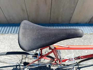 Stupendo telaio in acciaio Brazzo adesivata Marabelli misura 54 c-c, qualche segno dovuto all'utilizzo, ma nel complesso un buon conservato; serie sterzo, movimento centrale, mozzi e gruppo cambio Campagnolo, guarnitura e pedali Ofmega, leve freno Sacconi e pinze Universal 68, sella San Marco Laser, cerchi Nisi per copertoncino.