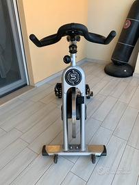 Bici da spinning in buone condizioni, computerino per monitorare sia l’allenamento che le prestazioni fisiche, dotato della connessione bluetooth per collegamenti con altri dispositivi. Il computerino monitora l’allenamento in esecuzione ed il collegamento le prestazioni fisiche. Pedali predisposti per attacchi con scarpe specifiche o per tennis normali. Sella e manubrio regolabile sia in altezza che in profondità. Abbastanza maneggevole per spostamenti grazie anche alle rotelline anteriori. Colore struttura grigio, sella e manubrio neri.