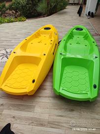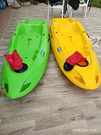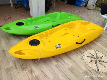 Si vendono in coppia o separatamente. Il prezzo indicato di 280.00€ è per un solo pezzo. Jolly made in Italy di Big Mama Kayak. Sit on top da 260 cm per 86 cm di larghezza, che garantisce estrema stabilità. Ideale per utenti principianti ed in evoluzione di tecnica, alla ricerca di un prodotto leggero, facilmente trasportabile e stabile. Chiglia a “ trimarano”, prua ben definita e maniglie integrate racchiudono gli elementi fondamentali per un kayak da famiglia per un sano divertimento in acqua. Puntapiedi a pettine integrato per le varie altezze persona. Comodo gavone a prua a tenuta stagna. Porta pagaia laterale utilissimo per fissare la pagaia alla canoa. Maniglia laterale per il trasporto a “ valigia”. Vano di poppa piatto che facilità la risalita in caso di bagno, molto utile anche per trasportare uno zaino. Fori di svuotamento per l’acqua in eccesso, che permettono di far defluire l’acqua oltre la linea di galleggiamento in caso di “ondata”. CARATTERISTICHE TECNICHE: LUNGHEZZA 260 CM LARGHEZZA 86 CM ALTEZZA 38 CM PESO : 19 KG CAPACITA’ DI CARICO : 115 KG ( distribuiti sull’intero scafo) MANIGLIE TRASPORTO PUNTAPIEDI INTEGRATO Si segnala che hanno qualche graffio dovuto all' utilizzo e trasporto.